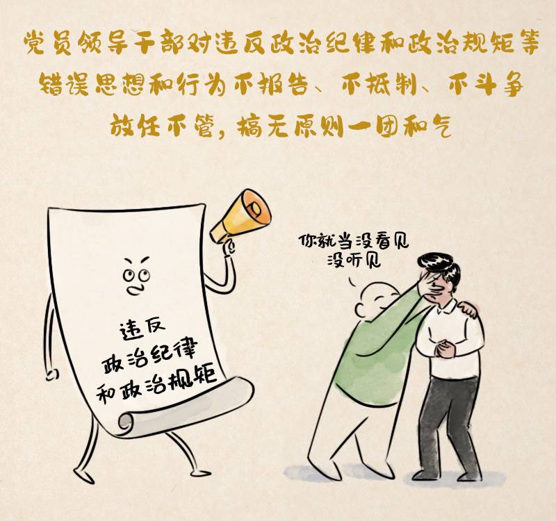 第七十五條 黨員領(lǐng)導(dǎo)干部對違反政治紀(jì)律和政治規(guī)矩等錯誤思想和行為不報告、不抵制、不斗爭,放任不管,搞無原則一團和氣,造成不良影響的,給予警告或者嚴(yán)重警告處分;情節(jié)嚴(yán)重的,給予撤銷黨內(nèi)職務(wù)或者留黨察看處分。