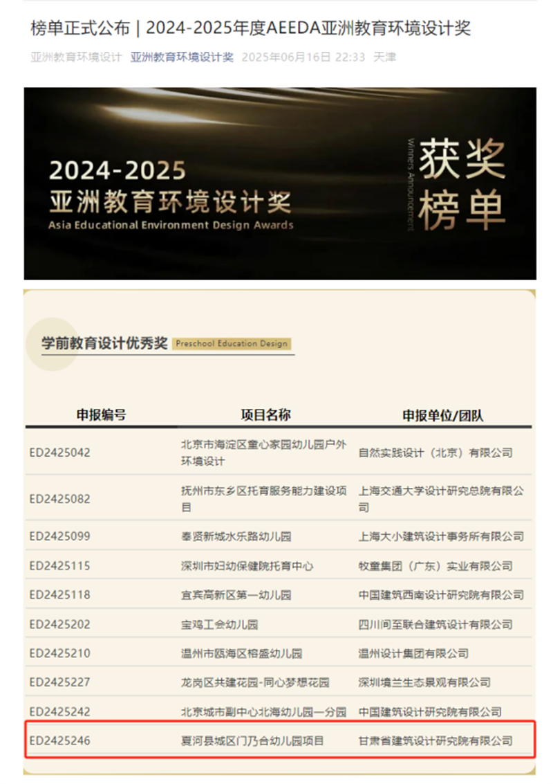 近日,備受矚目的2024-2025年度AEEDA亞洲教育環(huán)境設(shè)計(jì)獎(Asia Educational Environment Design Awards)獲獎名單正式揭曉。由甘肅工程咨詢集團(tuán)旗下省建筑設(shè)計(jì)院設(shè)計(jì)的夏河縣城區(qū)門乃合幼兒園項(xiàng)目,從百余件參賽作品中脫穎而出,榮膺學(xué)前教育設(shè)計(jì)領(lǐng)域優(yōu)秀獎,為甘肅建筑設(shè)計(jì)行業(yè)贏得了國際聲譽(yù)。