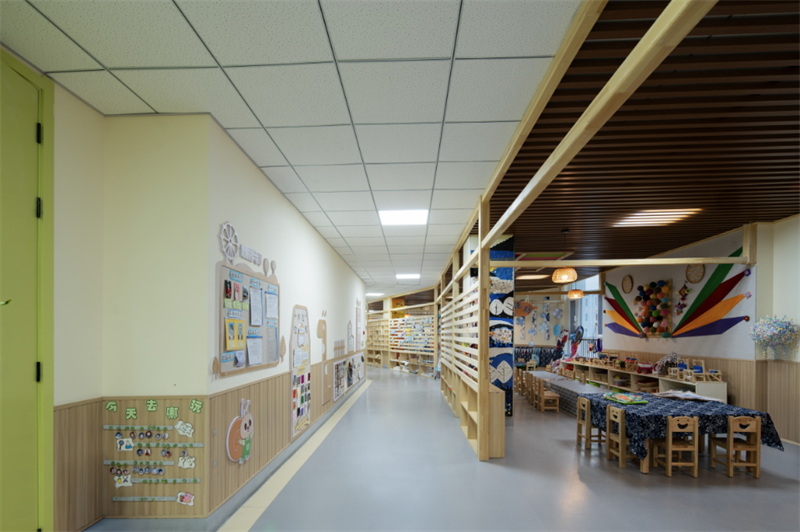 設(shè)計(jì)團(tuán)隊(duì)秉承“文化根系·生態(tài)課堂”的核心理念,實(shí)現(xiàn)了三大創(chuàng)新突破:文化傳承創(chuàng)新,巧妙解構(gòu)傳統(tǒng)藏式建筑語匯,以象征性的“煨桑臺”形態(tài)塑造入口空間,并運(yùn)用夯土墻、木質(zhì)格柵等本土材料與工藝,喚醒地域文化記憶。生態(tài)教育融合,充分利用場地自然高差,構(gòu)建多層級生態(tài)活動圈。設(shè)置屋頂農(nóng)場、戲水溪谷、觀星臺等多元互動空間,鋪設(shè)出一條“從土壤到星空”的自然認(rèn)知與探索路徑。兒童友好設(shè)計(jì),深度契合3-6歲兒童行為特征,引入模塊化家具系統(tǒng),并融入光影劇場、交互藝術(shù)墻等智慧化設(shè)施,充分激發(fā)幼兒的好奇心、探索精神與創(chuàng)造力。