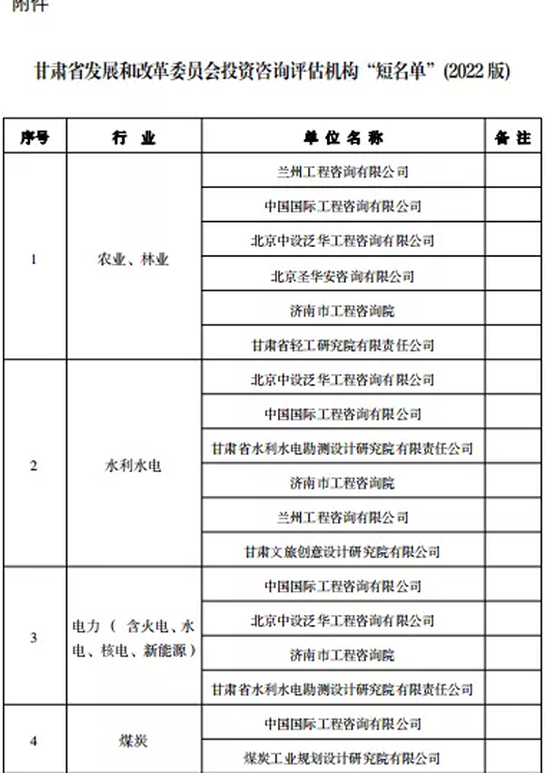 近日,省發(fā)改委公布2022年進(jìn)入省發(fā)改委投資咨詢(xún)?cè)u(píng)估機(jī)構(gòu)企業(yè)名單,甘肅省水利水電勘測(cè)設(shè)計(jì)研究院有限責(zé)任公司成功入圍三個(gè)行業(yè)板塊。