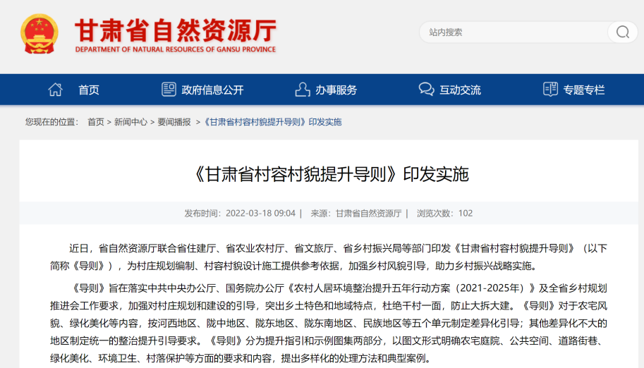 為進(jìn)一步貫徹落實中共中央辦公廳、國務(wù)院辦公廳《農(nóng)村人居環(huán)境整治提升五年行動方案(2021—2025年)》及全省鄉(xiāng)村規(guī)劃推進(jìn)會精神,由甘肅省城鄉(xiāng)規(guī)劃設(shè)計研究院有限公司牽頭,聯(lián)合甘肅省建筑設(shè)計研究院有限公司、西北師范大學(xué)城市規(guī)劃與旅游景觀設(shè)計研究院編制的《甘肅省村容村貌提升導(dǎo)則(試行)》(以下簡稱《導(dǎo)則》),于3月18日由省自然資源廳、省住建廳、省農(nóng)業(yè)農(nóng)村廳、省文旅廳、省鄉(xiāng)村振興局等五部門聯(lián)合印發(fā)?!秾?dǎo)則》的發(fā)布為全省村莊規(guī)劃編制工作提供了參考依據(jù),是推進(jìn)鄉(xiāng)村振興戰(zhàn)略實施的重要抓手,是改善我省農(nóng)村人居環(huán)境、建設(shè)美麗甘肅的核心引導(dǎo),將在規(guī)范我省村容村貌提升、弘揚傳統(tǒng)文化、突出鄉(xiāng)土特色和地域特點,杜絕千村一面,防止大拆大建等方面發(fā)揮重要作用。