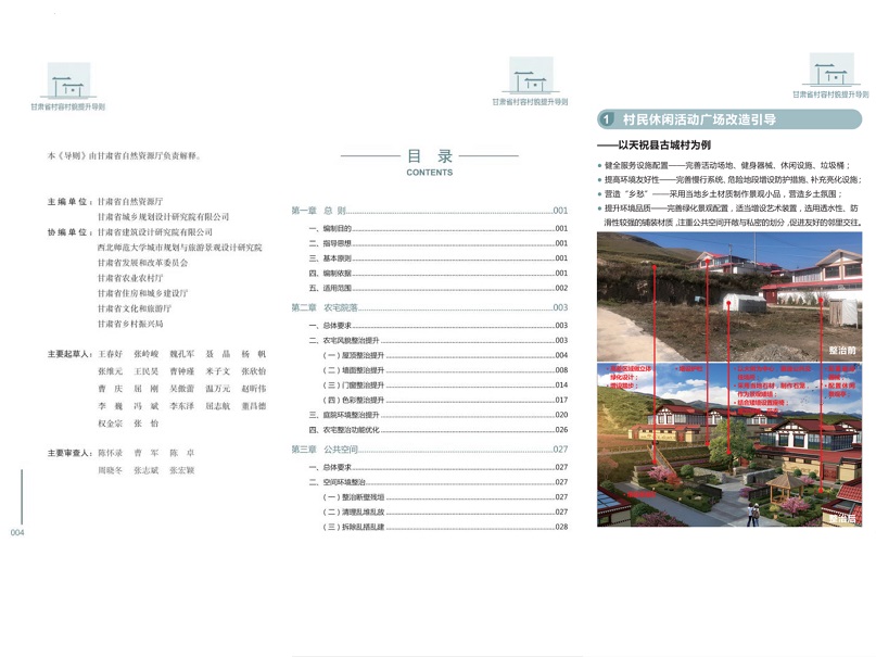 《導(dǎo)則》成果分為提升指引和示例圖集兩部分。提升指引部分以文字形式明確了甘肅省村容村貌整治提升的要求和內(nèi)容,包括總則、農(nóng)宅院落、公共空間、道路街巷、綠化美化、環(huán)境衛(wèi)生、村落保護(hù)、保障機(jī)制和附錄等9個章節(jié),對全省5個國家級歷史文化名村和54個傳統(tǒng)村落實行特殊保護(hù);示例圖集部分以圖文形式提出了村容村貌提升的多種、可選處理方法和典型案例,主要包括農(nóng)宅院落、公共空間、道路街巷、綠化美化、環(huán)境衛(wèi)生、村落保護(hù)等6部分內(nèi)容。