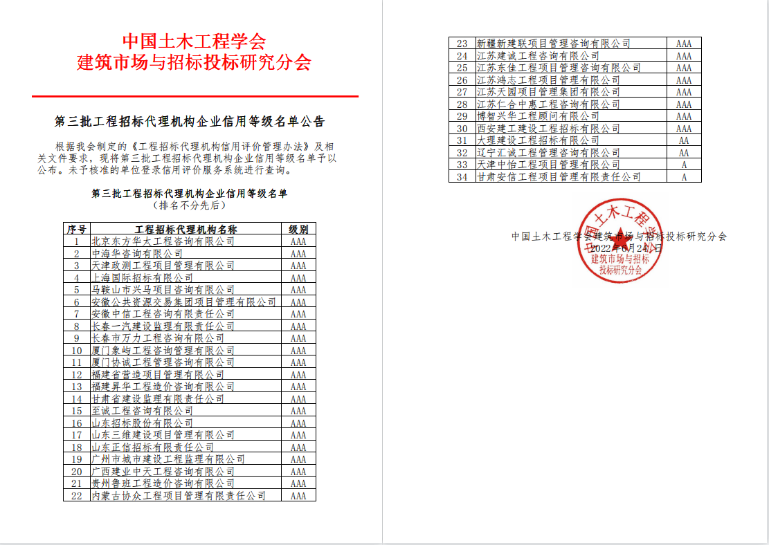 為認真貫徹落實甘肅省第十四次黨代會精神,更好地發(fā)展招標代理業(yè)務,努力推進企業(yè)高質量發(fā)展,2022年6月,甘肅省建設監(jiān)理有限責任公司積極籌備參加了由中國土木工程學會建筑市場與招投標研究分會組織的招標代理機構信用評價,日前,第三批工程招標代理機構企業(yè)信用等級名單公布,建設監(jiān)理公司榮獲中國土木工程學會建筑市場與招標投標研究分會招標代理機構AAA級信用企業(yè)稱號。