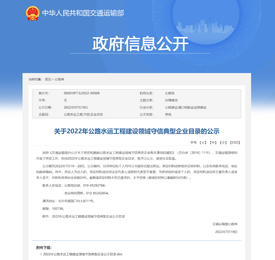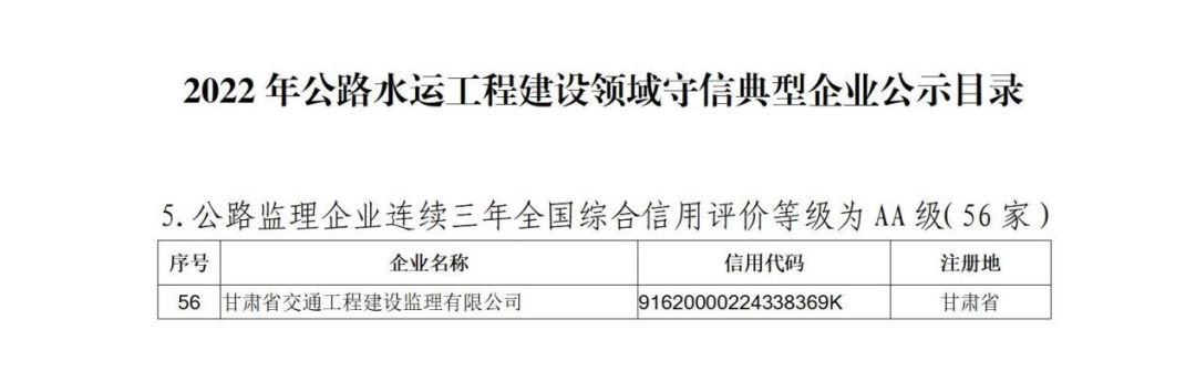 甘肅省交通工程建設(shè)監(jiān)理有限公司上榜交通運(yùn)輸部公路水運(yùn)工程建設(shè)領(lǐng)域守信典型企業(yè)目錄