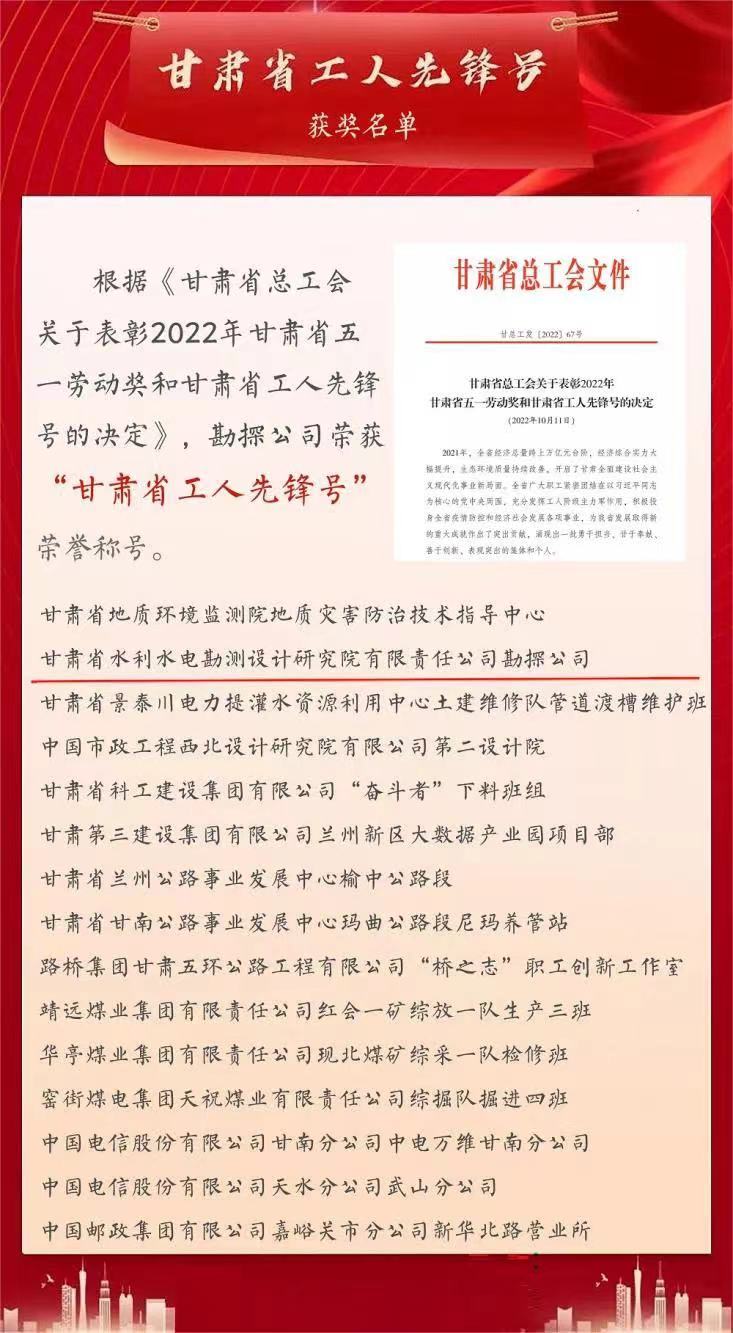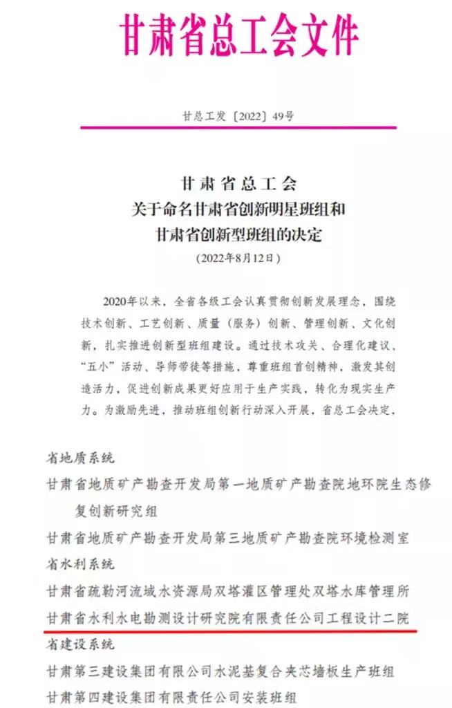 近日,甘肅省總工會(huì)發(fā)布2022年度“甘肅省工人先鋒號(hào)”和“甘肅省創(chuàng)新型班組”名單,甘肅省水電設(shè)計(jì)院的勘探公司榮獲2022年度“甘肅省工人先鋒號(hào)”稱(chēng)號(hào),工程設(shè)計(jì)二院榮獲“甘肅省創(chuàng)新型班組”榮譽(yù)稱(chēng)號(hào)。