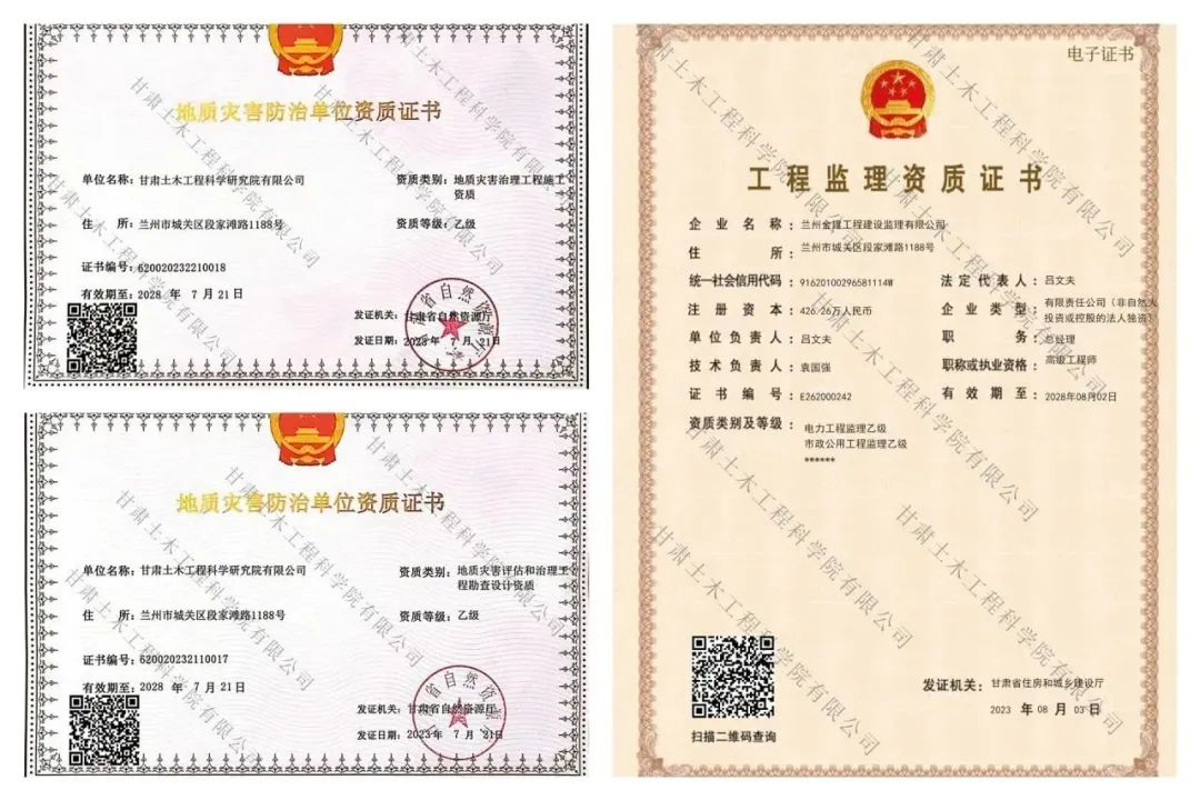 近期,土木工程院申報(bào)的地質(zhì)災(zāi)害評(píng)估和治理工程勘查設(shè)計(jì)乙級(jí)、地質(zhì)災(zāi)害治理工程施工乙級(jí)兩項(xiàng)資質(zhì)獲省自然資源廳批準(zhǔn)。土木工程院全資子公司蘭州金建工程建設(shè)監(jiān)理有限公司申報(bào)的電力工程監(jiān)理乙級(jí)資質(zhì)也順利通過(guò)省住房和城鄉(xiāng)建設(shè)廳審批。
