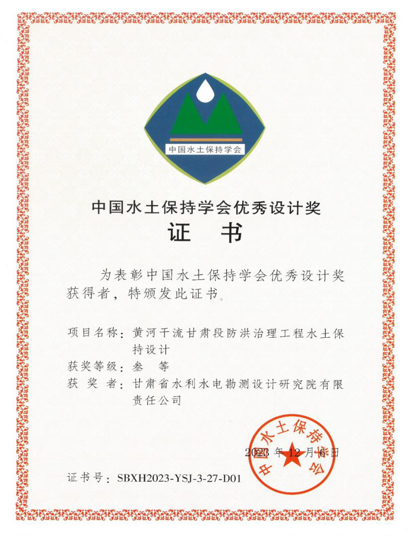 據(jù)悉,這是繼《甘肅省引洮供水一期工程水土保持設(shè)計》獲第三屆中國水土保持學術(shù)大會優(yōu)秀設(shè)計二等獎后,再次喜獲此獎項。中國水土保持學術(shù)大會制度自2018年建立以來,中國水土保持學會搭建了我國水土保持領(lǐng)域規(guī)模最大、水平最高的學術(shù)交流平臺,現(xiàn)已成為中國水土保持學術(shù)交流的重要品牌。中國水土保持學會優(yōu)秀設(shè)計獎每兩年評選一次,主要獎勵我國在水土保持規(guī)劃與設(shè)計領(lǐng)域中技術(shù)先進、成效顯著、理念創(chuàng)新的項目成果。