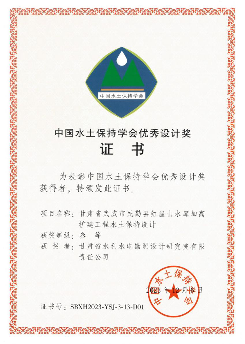 近日,第四屆中國水土保持學術(shù)大會在福建福州舉行。省水電設(shè)計院勘測設(shè)計的《武威市民勤縣紅崖山水庫加高擴建工程水土保持設(shè)計》《黃河干流甘肅段防洪治理工程水土保持設(shè)計》兩項水土保持設(shè)計成果榮獲第四屆中國水土保持學會優(yōu)秀設(shè)計三等獎。